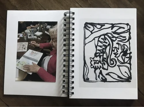 A small group of women residing in a memory care facility outside of Boston met monthly for a special art time. I liked to take their photo while they were working on their art-then I added to their sketchbooks as a keepsake for them to share with family and friends who visit.